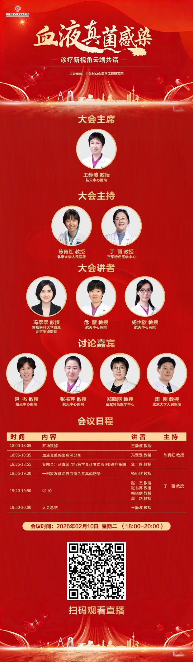 为推动血液真菌感染诊疗水平的同质化提升,分享前沿研究成果与临床实践经验,助力临床医师优化诊疗策略、强化全程管理能力。中关村益心医学工程研究院于2026年1月-2026年12月在线上举办“血液真菌感染诊疗新视角云端共话”,为了加强不同科室的专家学者们更密切的学术探讨交流机会,本项目采用线上的形式展开,预计召开30场线上交流会。为全国血液领域同仁搭建高效的学术交流平台,共同探讨诊疗难点与解决方案,护航血液疾病患者的诊疗安全。