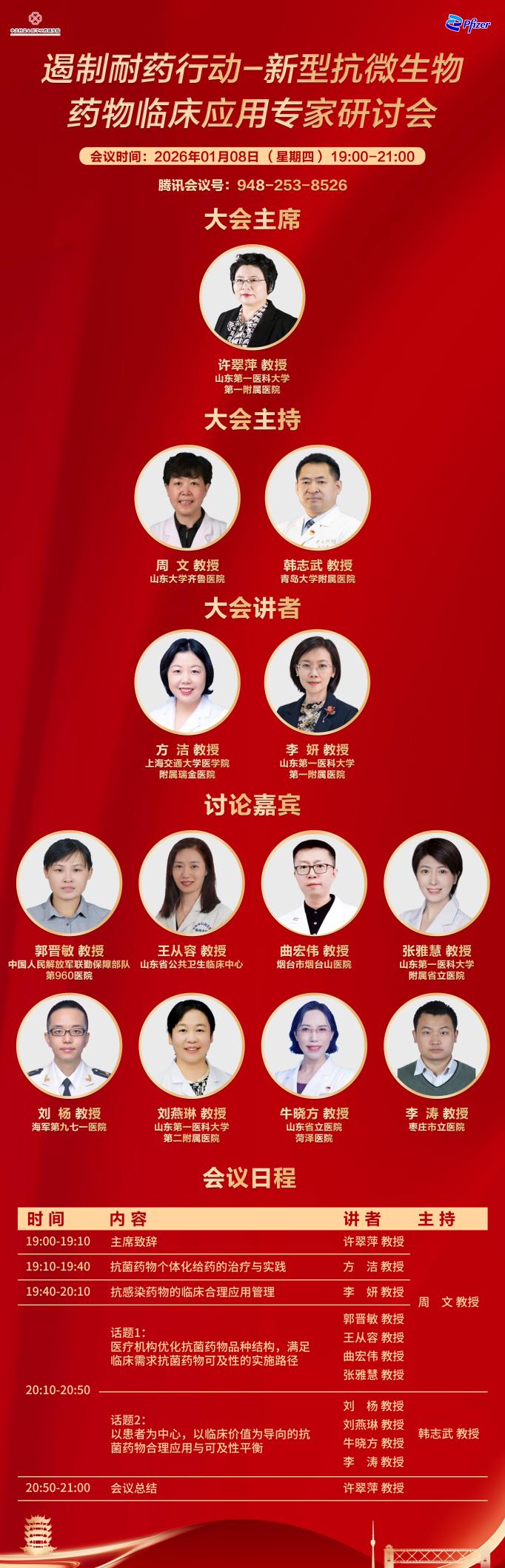 为加强落实党的二十大关于推进健康中国建设的战略部署,认真贯彻《关于进一步完善医疗卫生服务体系的意见》《关于推动公立医院高质量发展的意见》《健康中国“2030”规划纲要》《健康中国行动(2019-2030年)》等文件精神,推动优质高效整合型医疗卫生服务体系构建,贯彻多学科协同发展的宗旨来共同应对当前的医疗发展中的问题和困难。为促使医疗机构进一步加强抗菌药物科学化、规范化、常态化管理,全面提升抗菌药物合理应用水平,有效遏制细菌耐药,于2026年1月8日召开“遏制耐药行动-新型抗微生物药物临床应用专家研讨会”会议,共同探讨新型抗菌药物临床应用及合理使用等相关话题。